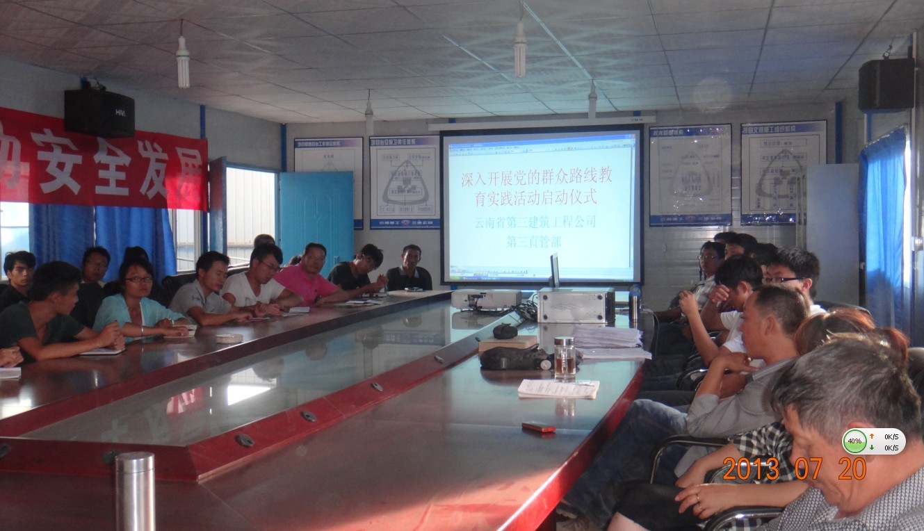 為全面貫徹落實公司關于“深入扎實開展黨的群眾路線教育實踐活動”動員大會及實施方案部署要求,7月23日上午,第八直管項目部在嵩明錦繡蘭苑小區廉租房項目會議室召開了黨的群眾路線教育實踐活動動員大會。??會議上,黨支部書記陳登弟傳達了公司黨委關于公司深入開展黨的群眾路線教育實踐活動動員會的會議精神和習近平總書記在中央教育實踐...